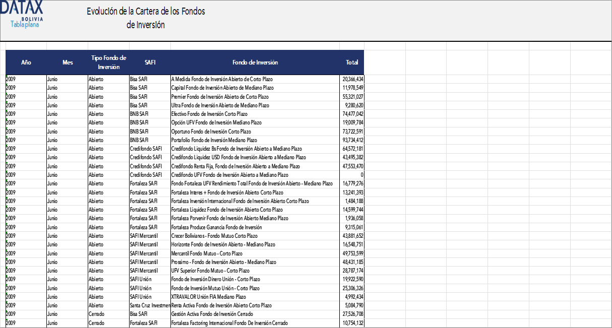 This database presents monthly, since January 2005, the evolution of the portfolio managed by the SAFIs authorized in Bolivia (Bisa, Credifondo, Fortaleza, Mercantil, Nacional, Santa Cruz Investment, and Unión), disaggregated by type of fund (open or closed) and by specific fund (Capital, Premier, Ultra, A Medida, etc.).