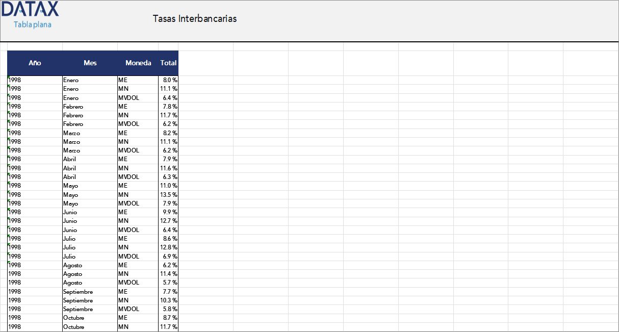 This database presents the monthly interbank rates reported by the Central Bank of Bolivia since 2009, covering different currencies (Bolivianos, Dollars, Euros, UFV, MVDOL). It allows for the assessment of the cost of money between financial institutions, identification of liquidity trends, and analysis of the impact of monetary policies in the short and medium term.