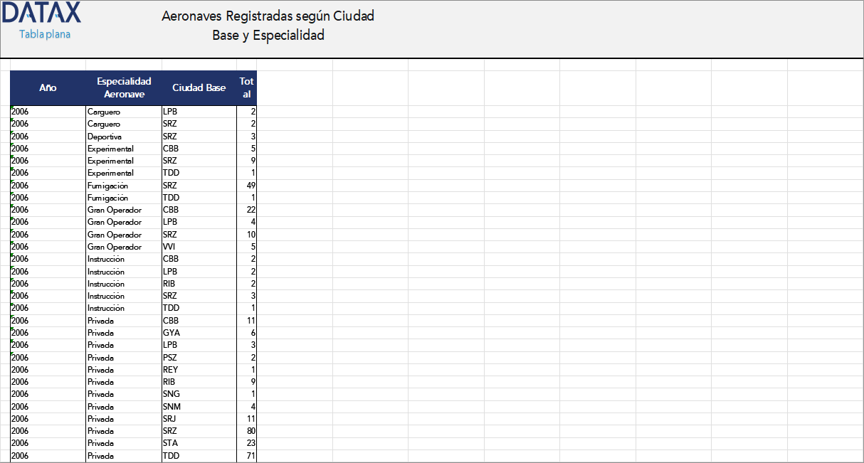 Esta base de datos, proporcionado por la Dirección General de Aeronáutica Civil (DGAC), ofrece un panorama detallado de las aeronaves registradas en Bolivia, organizadas por ciudad base y tipo de especialidad. Esta información es clave para el análisis de capacidades aeronáuticas regionales, planificación logística, inversión en infraestructura aérea y estudios de seguridad operacional. Aunque el registro se encuentra inactivo, su valor histórico lo convierte en un recurso esencial para investigadores y tomadores de decisiones del sector aéreo.