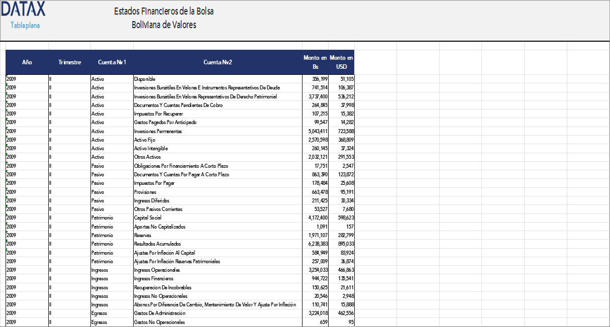 Información de los estados financieros de la Bolsa Boliviana de Valores, datos desde el año 2009.