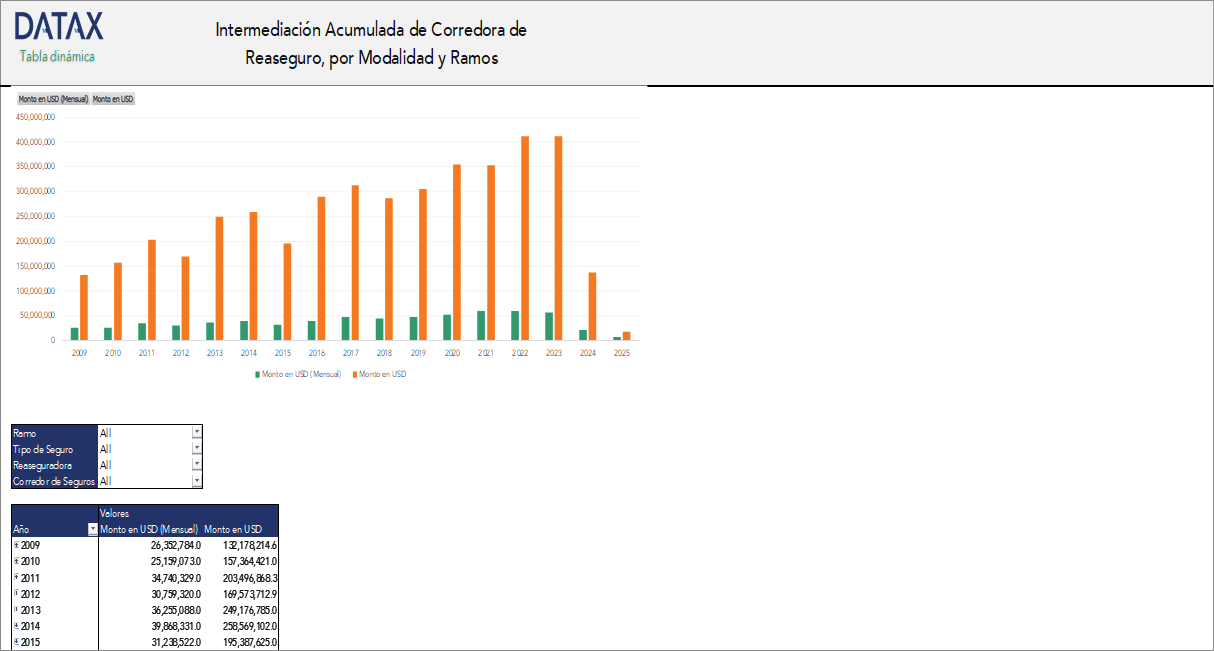 Este recurso es fundamental para entender la dinámica del mercado de reaseguros en Bolivia, facilitando análisis de intermediación por modalidad, corredora, y ramo asegurador.