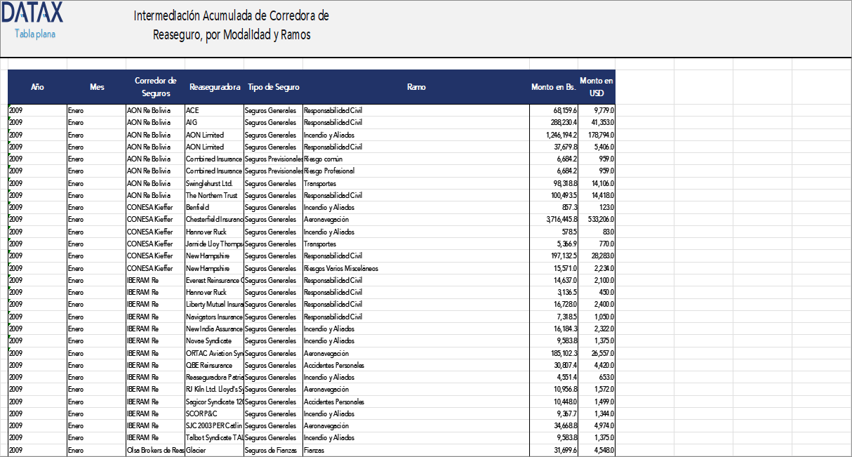 Esta base de datos, proporcionado por la Autoridad de Fiscalización y Control de Pensiones y Seguros (APS) de Bolivia, contiene información desde enero de 2009 hasta diciembre de 2024, actualizada hasta diciembre de 2023, sobre las operaciones de intermediación realizadas por corredoras de reaseguro en el país. La intermediación de reaseguro consiste en la gestión de contratos donde las aseguradoras transfieren riesgos a reaseguradoras a través de estas corredoras.