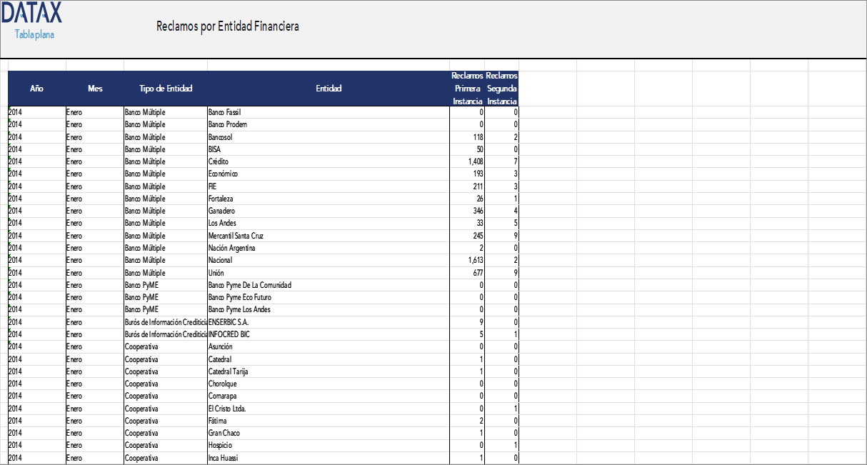 Esta base de datos proporciona un registro detallado y actualizado de los reclamos presentados por los usuarios ante la Autoridad de Supervisión del Sistema Financiero (ASFI), desglosado por tipo de entidad financiera y nombre de la institución. Con datos mensuales desde enero de 2014 hasta octubre de 2024, esta herramienta es clave para entender la evolución de la satisfacción del cliente, identificar patrones de riesgo y evaluar la calidad del servicio financiero en Bolivia.