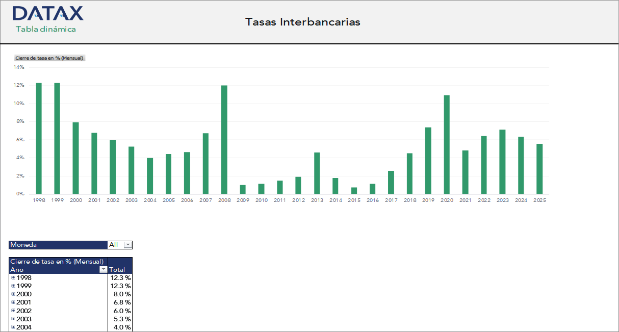 - Multimoneda: Incluye tasas en moneda nacional y extranjera.